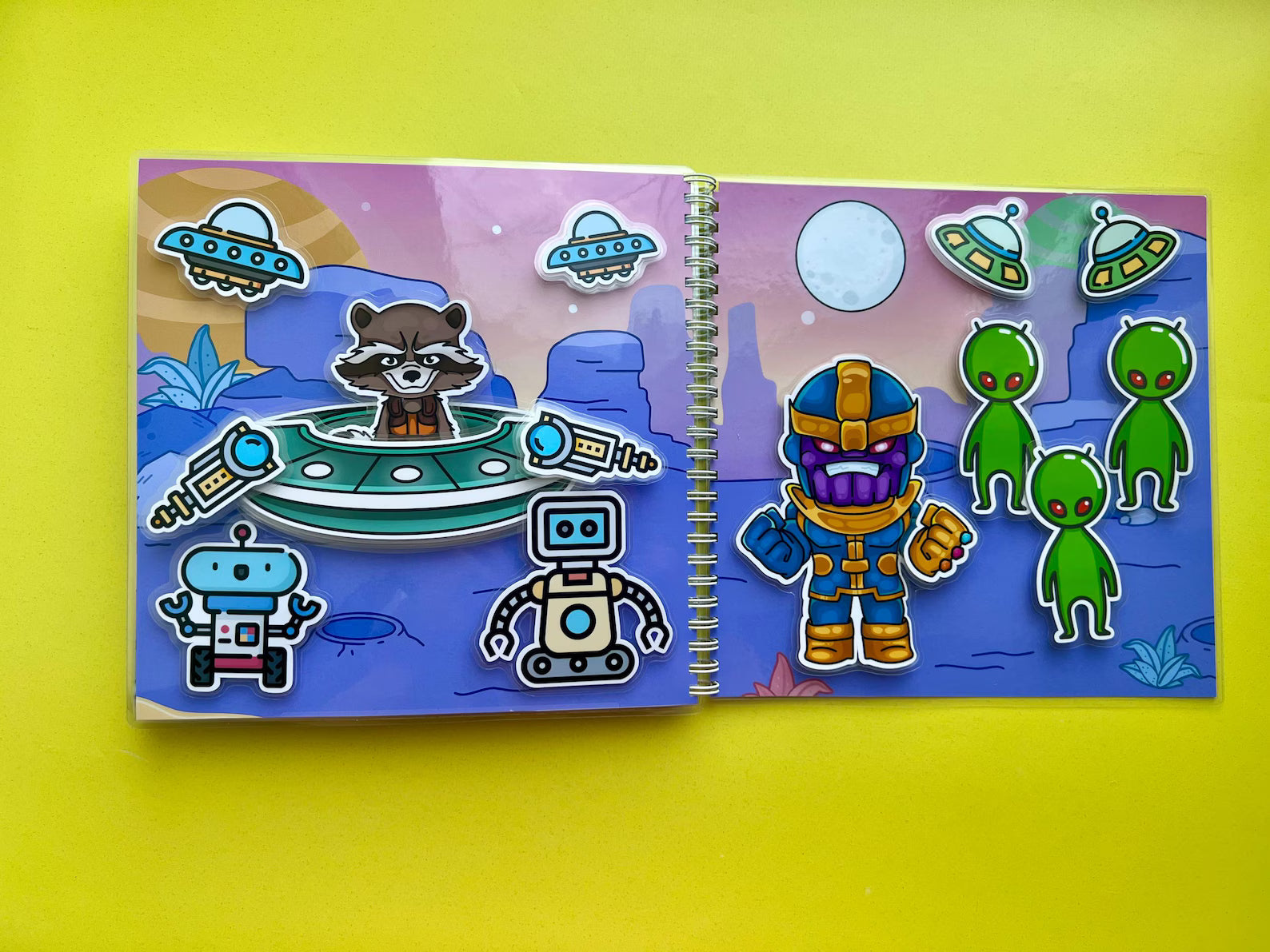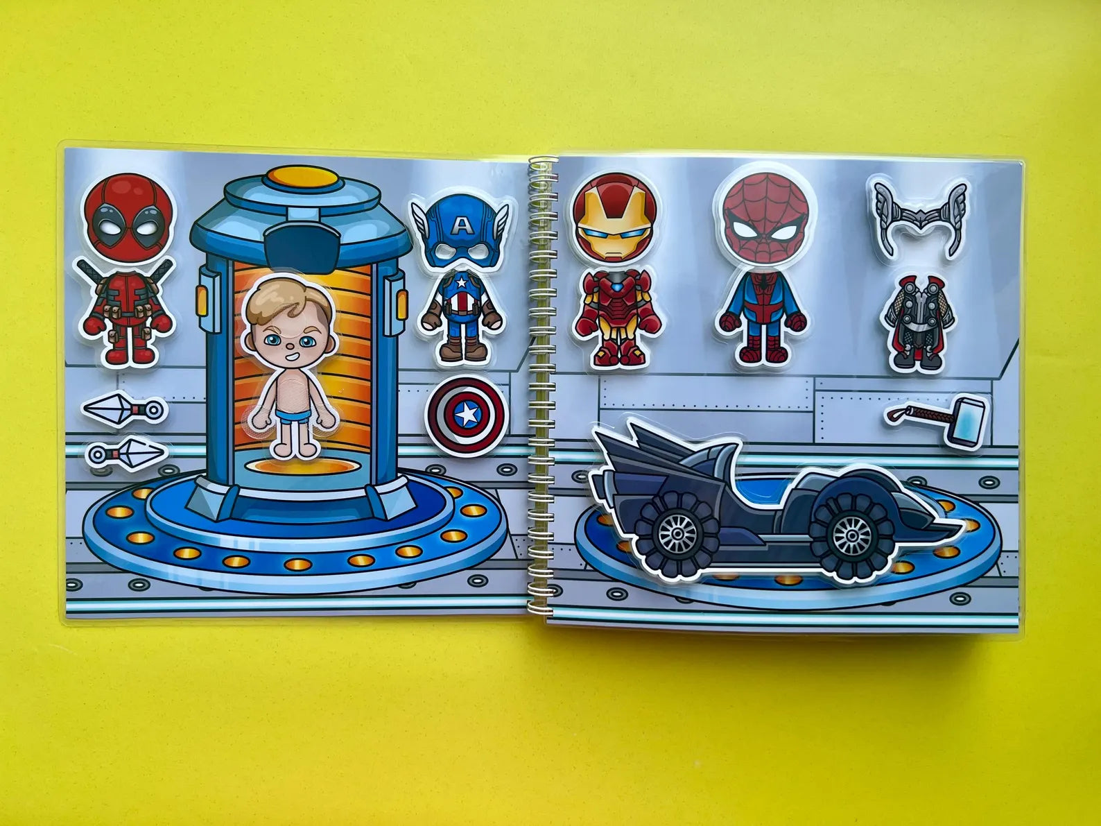 El Libro Interactivo de Superhéroes es un material didáctico diseñado para que los niños creen sus propias aventuras mientras juegan sin pantallas. Incluye figuritas con velcro adhesivo reutilizable, que pueden colocarse y retirarse fácilmente para formar distintas escenas y misiones heroicas.