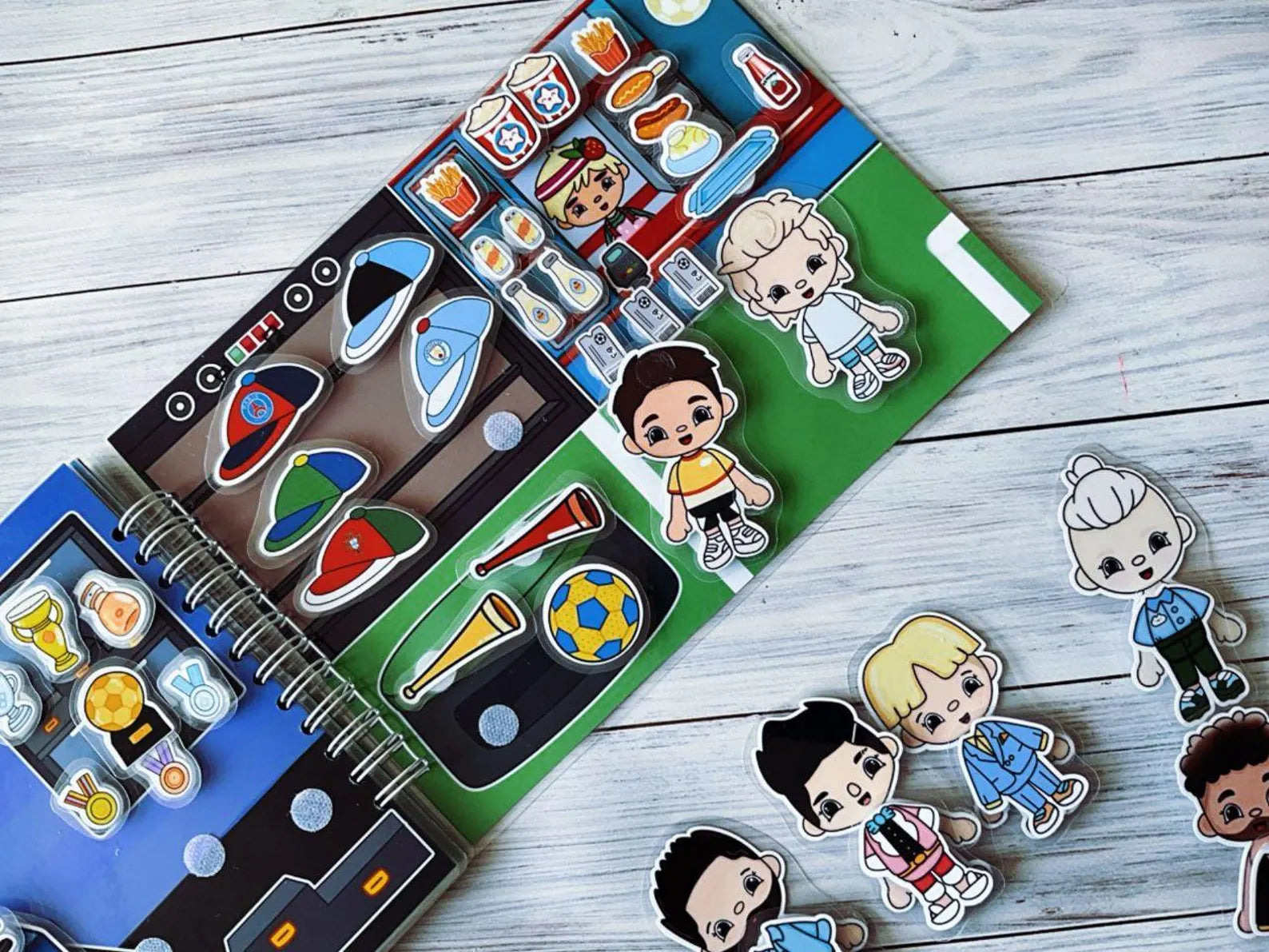 El libro interactivo de fútbol con figuritas y velcro adhesivo permite a niñas y niños vivir la emoción del deporte rey a través del juego creativo. Incluye 5 páginas con diferentes escenarios, como la cancha, entrenamientos y partidos, donde podrán mover, pegar y reorganizar las figuritas para crear jugadas y sus propias historias futboleras. Este libro fomenta la imaginación, la motricidad fina y el aprendizaje lúdico, siendo ideal como regalo educativo o actividad sin pantallas.